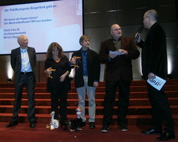 Der Publikumspreis wurde am Nikolaustag im Colosseum Theater in Essen durch Moderator Peter Haas, LfM-Direktor Dr. Jürgen Brautmeier und Norbert Sander (LfM-Bürgermedien) überreicht. Es ist das erste Mal, dass der Publikumspreis für Bürgerfunk in den Hochsauerlandkreis geht. Ein toller Erfolg für die Akademie 6 bis 99 in Arnsberg, ihr gleichnamiges Radio und für das Marionettentheater FIRO, das im Rahmen einer Akademie-Veranstaltung am Berufskolleg am Eichholz in Arnsberg die Puppen zum Tanzen brachte.