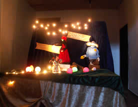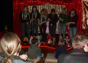 Zusammen mit den 6 Mädchen aus unserem Mädchenprojekt, unseren beiden Töchtern und unserer neuen Mitspielerin Andrea Hagedorn, gestalteten wir diesen adventlichen Theaternachmittag im Discoraum des Jugendbegegnungszentrums, den wir in einen märchenhaften Theaterraum verwandelten. |