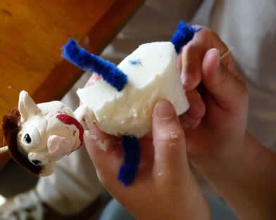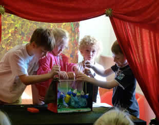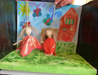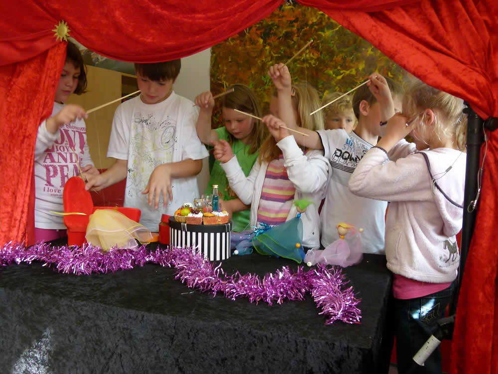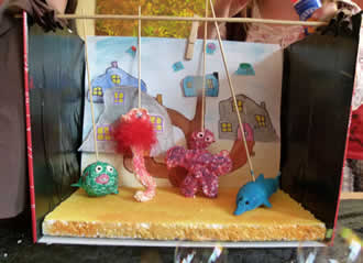 Ob Schlümpfe, Lillifee, Hanni und Nanni, Drachen oder Unterwasserwelten, schnell hatte jedes Kind eine eigene Geschichte gefunden und der Bühnenbau konnte beginnen.. Bühnenbilder wurden gemalt und aus den unterschiedlichsten Materialien Bäume, Häuser, Wasserpflanzen und vieles mehr hergestellt. Die entsprechenden Spielfiguren wurden aus Modelliermasse gebaut, dann angemalt und mit Stoffen farbenfroh angezogen.