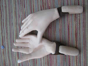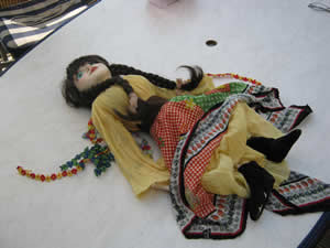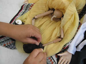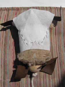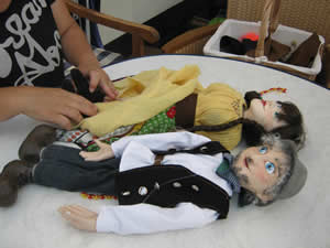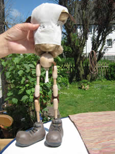 Kniepuppen hängen zwischen zwei Hölzern an einem Faden und werden mit dem Knie z.B. rythmisch zur Musik bewegt. Deshalb heißen sie Kniepuppen.